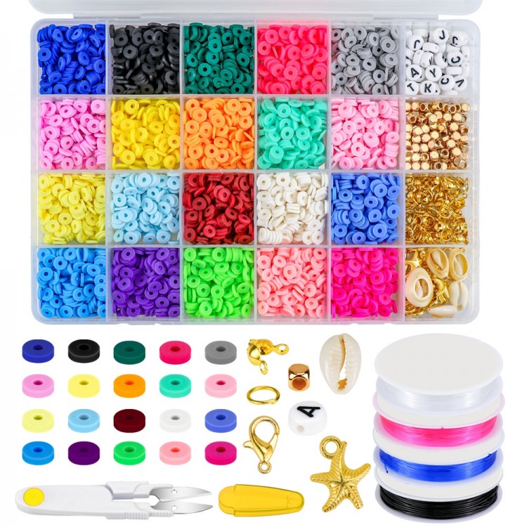 [All You Need Included] - A box of about 4000pcs flat clay beads in 20 colors and 270pcs charms kit(contains pendants, jump rings, random letter beads, lobster clasp, etc.), 4 roll of 5 meters elastic strings, a scissors(random color), to meet all your needs for jewelry making.